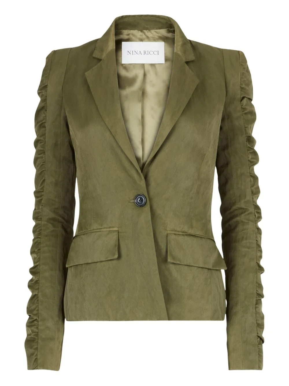 crinkled ruffled-sleeves blazer Highlights - Green - Crinkled-effect - Ruffled-sleeves - Button-fastening - Front flap-pockets - Cotton Imported Composition Outer: Cotton 100%, Polyester 100% Lining: Viscose 100% Washing instructions Dry Clean Only