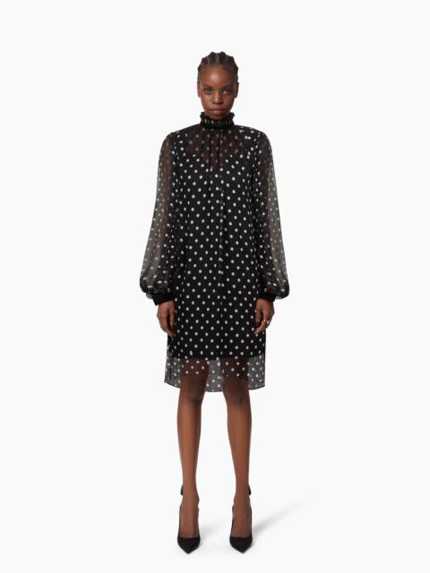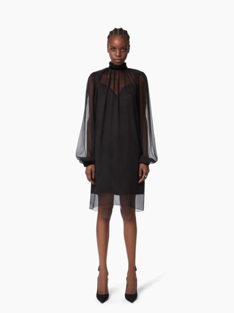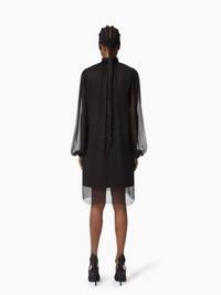 This black midi dress in crinkled silk chiffon embodies both lightness and elegance. Featuring a ruched high neckline and sheer long sleeves, it creates a fluid, airy silhouette. Its subtle play of transparency contrasts with an opaque slip lining, evoking a look that is both romantic and bold—true to the couture spirit of Maison Nina Ricci. COMPOSITION & DETAILS - 100% silk. - Straight cut. - Midi length. - High neckline. - Opaque slip lining. - Model is 180 cm/ 5ft 11in and wears a size 36 (FR). - Ref: 25ACRO056SE1400U9000