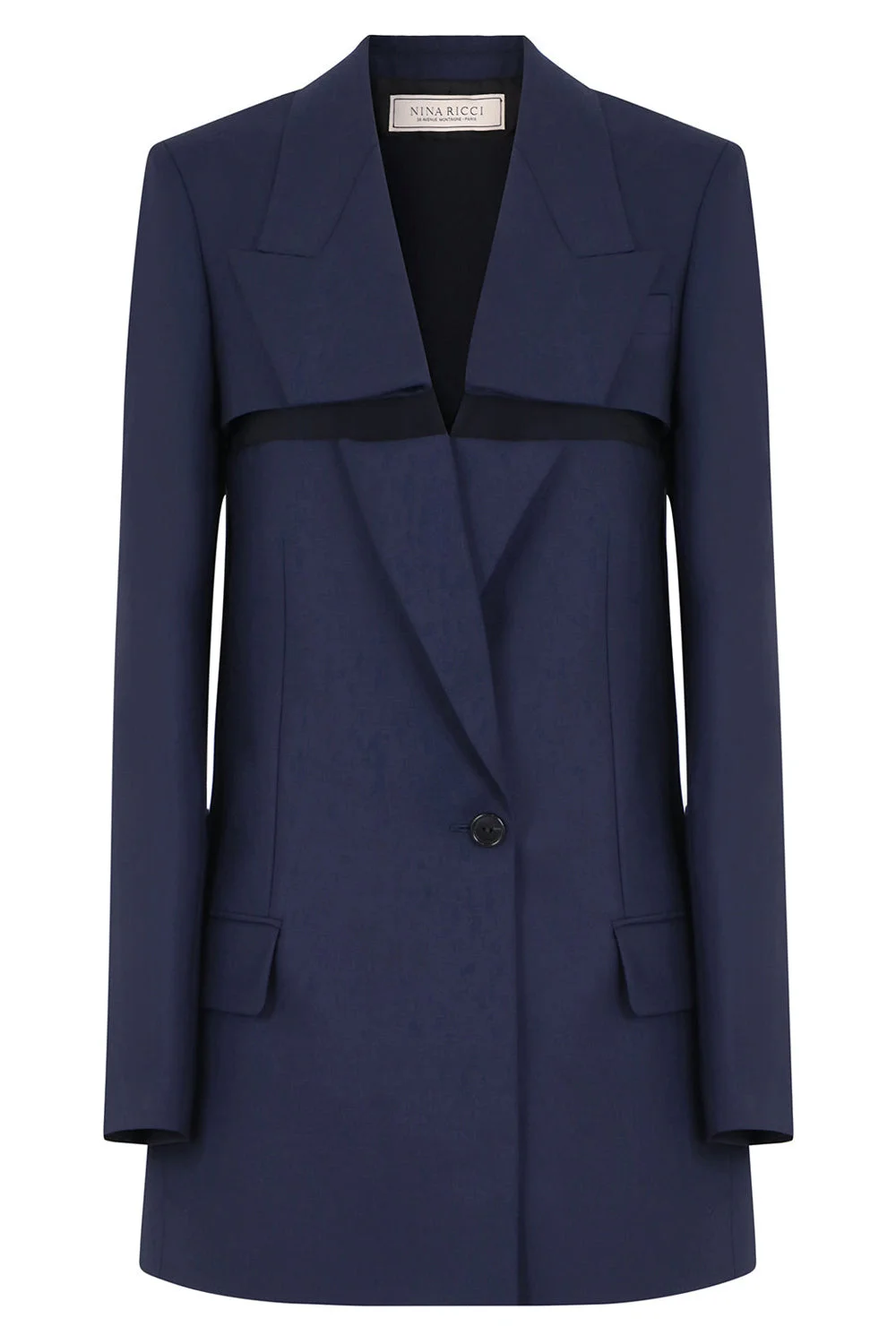 The Nina Ricci Deconstructed Tailored Blazer in Navy features a deconstructed collar and lapel, long sleeves, two front pockets and a single breasted front closure. Note: Can be worn multiple ways, see styling images Fabrication: 73% Virgin Wool, 27% Mohair Size and Fit Mateja: Model is 170cm/5’6” and is wearing a size FR36 Model Measurements: Bust 83cm, Waist 64cm, Hips 89cm ————— This style fits true to size. Measurements Size FR36: Bust 86cm, Waist 84cm, Hip 94cm, Length 78cm Size FR38: Bust 90cm, Waist 88cm, Hip 98cm, Length 78cm Size FR40: Bust 92cm, Waist 90cm, Hip 100cm, Length 78cm