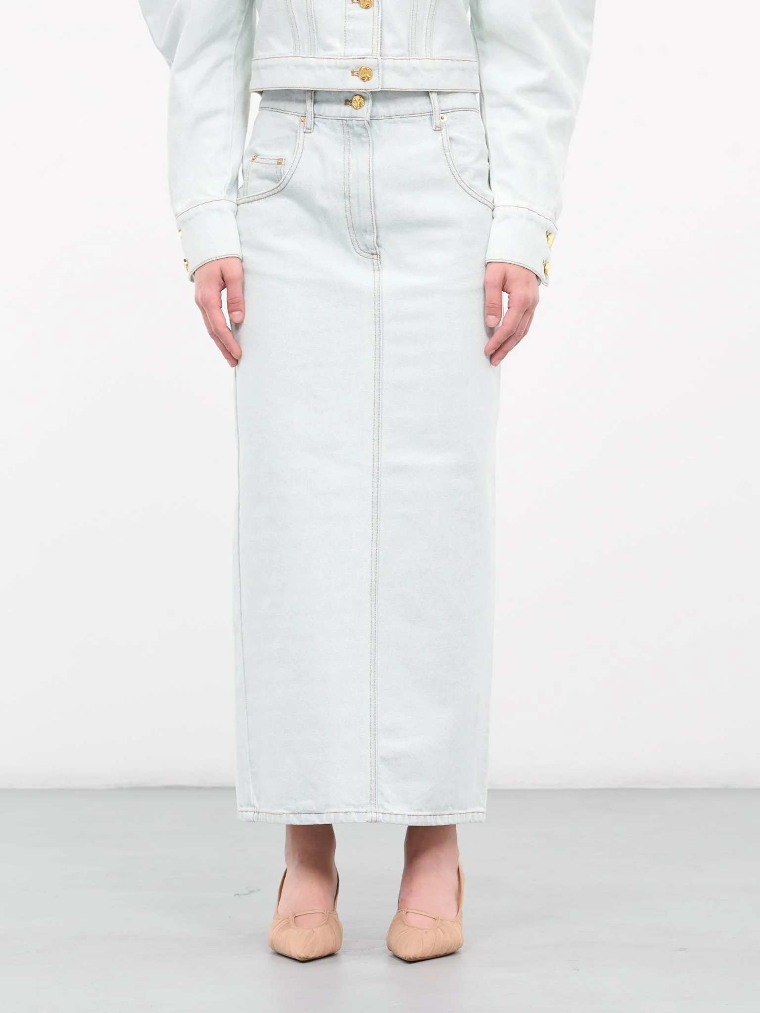 logo-patch high-waist skirt Highlights - Light blue - Cotton - Logo patch to the rear - Belt loops - Front button fastening - Classic five pockets - Straight hem - Long length Imported Composition Cotton 100%
