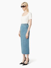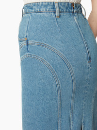New for the Spring-Summer 2025 season, this midi skirt in organic denim features couture details and a back slit for a resolutely contemporary look. COMPOSITION & DETAILS - 100% organic cotton. - Midi length. - High waist. - Back zipper closure. - Contrast topstitching. - Back slit. - Model is 181 cm and wears a size 36 (FR). - Ref : 25PDJU027CO1095U4690
