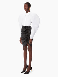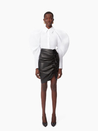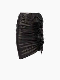 In the Fall-Winter 2024 collection, Harris Reed offers a fresh perspective on femininity through the midi skirt. This skirt, crafted in nappa leather with a luxurious, supple texture, is distinguished by its pencil cut and exquisite ruche and ruffle details. Complete the total Nina Ricci look by pairing it with a leather blazer. Fitted waist. If you are between 2 sizes, take 1 size up. COMPOSITION & DETAILS - 100% nappa lamb leather. - Midi length. - High waist. - Rear zip closure. - Model is 180 cm and wears a size 36 (FR). - Ref : 24AUJU016LB0072U9000