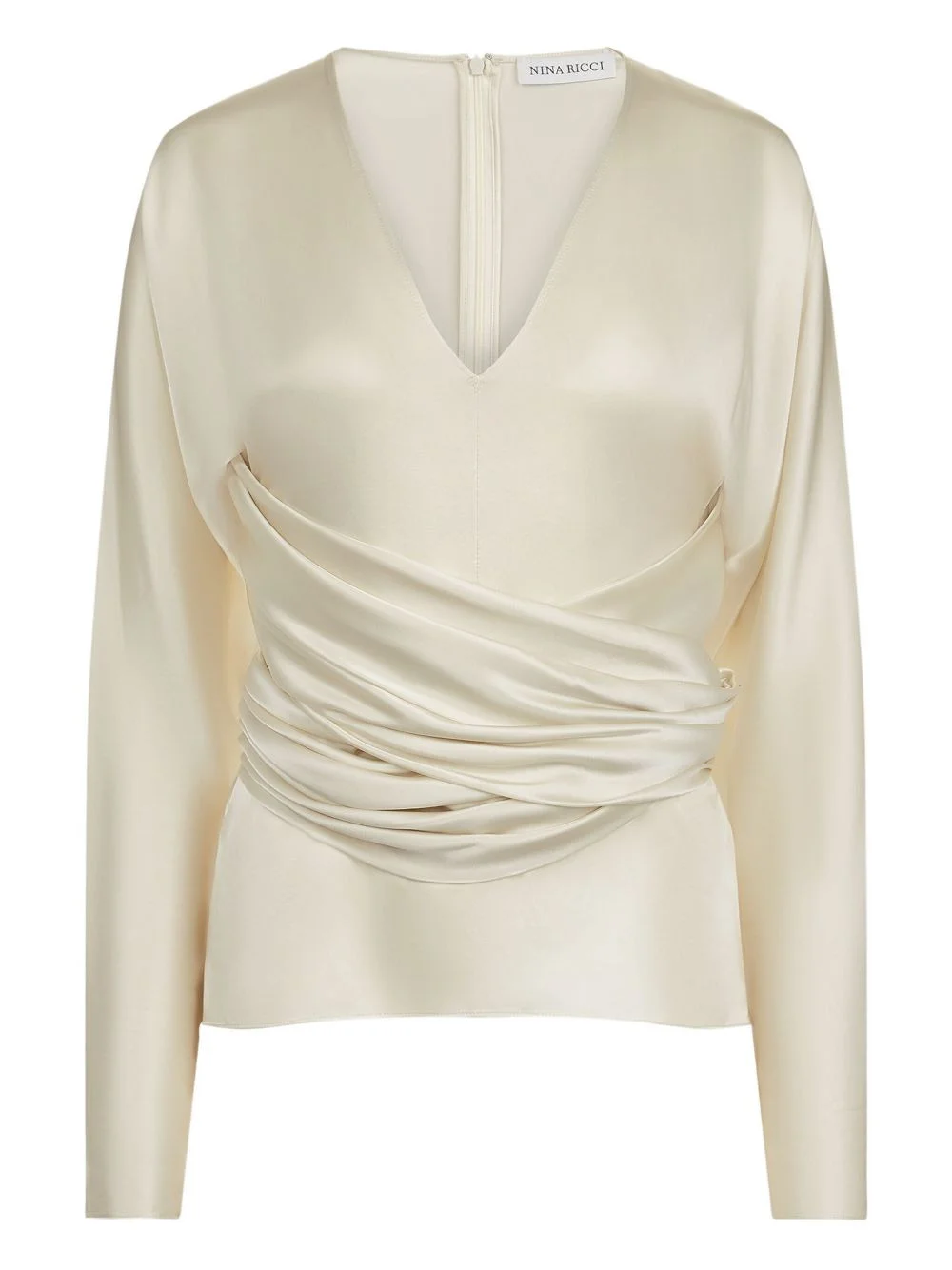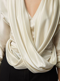 draped V-neck top Highlights - Off-white - V-neck - Draped detailing - Long sleeves - Wrap-effect waist Imported Composition Viscose 52%, Silk 37%, Elastane 11% Washing instructions Read Manufacturer Guidelines