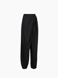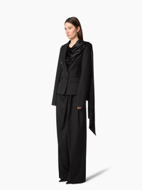 This wide-leg pant in black wool gabardine features an asymmetric draped detail delicately placed at the side, adding movement and sophistication to the silhouette. Its sculptural construction reimagines tailoring codes with a bold and modern twist. Designed for the Fall-Winter 2025 collection, it embodies Nina Ricci’s singular elegance and couture spirit. COMPOSITION & DETAILS - 100% virgin wool. - High waist. - Wide-leg fit. - Invisible side zip fastening. - 2 side slash pockets. - Model is 180 cm/ 5’11” and wears a size 36 (FR). - Ref: 25ACPA009WV0324U9000