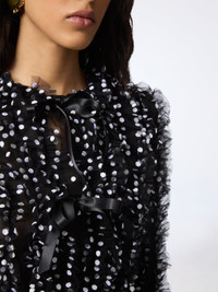 This embroidered polka dot jacket brings texture and contrast to the Spring-Summer 2026 collection. White dotted embroidery is layered over a sheer black base, creating a striking interplay of volume and transparency. The silhouette is fastened with fine ribbon ties, softening its graphic line. A crafted piece that blends delicacy and definition. COMPOSITION & DETAILS - 100% polyamide. - Tie fastening. - Model is 180 cm/ 5ft 11in and wears size 36 (FR). - Ref: 26PCVE021PA0508M1048