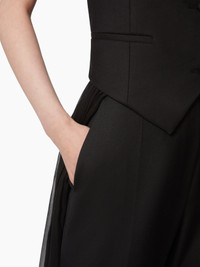 Emblematic of the Nina Ricci silhouette, the suit symbolizes timeless elegance. Harris Reed adapts and reinterprets it each season in a variety of styles. Crafted in black wool gabardine, these pants are enhanced by a flared cut and a pleat along the leg for a unique fall. Paired with a tailored jacket from the collection, they'll stand out for a total Nina Ricci look. COMPOSITION & DETAILS - 100% ethical virgin wool. - High waist. - Belt loops. - Concealed closure. - 2 bias pockets. - Model is 182 cm and wears a size 36 (FR). - Ref : 25PCPA005WV0322U9000