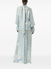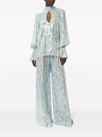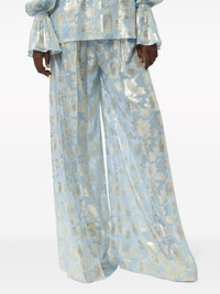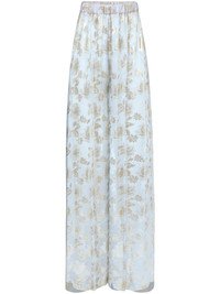 floral-jacquard palazzo pants Highlights - Light blue - Silk blend - Patterned jacquard - Foiled finish - High-waisted - Elasticated waistband - Palazzo design Imported Composition Lining: Viscose 100% Outer: Silk 75%, Polyester 25% SIZE & FIT Measurement FRONT RISE 15.35 in(39 cm) INSIDE LEG 32.28 in(82 cm) HIPS 43.3 in(110 cm) WAIST 27.55 in(70 cm) Washing instructions Dry Clean Only