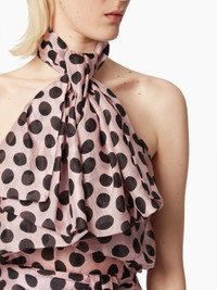 This top crafted in blush pink seersucker silk with polka dots, featuring a wide neckline, is distinguished by a fluid bow draped across the front, bringing a touch of sophistication to the silhouette. COMPOSITION & DETAILS - 100% silk. - Slim fit. - American neckline. - Model is 181 cm and wears a size 36 (FR). - Ref : 25PCTO023SE1404I2440