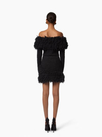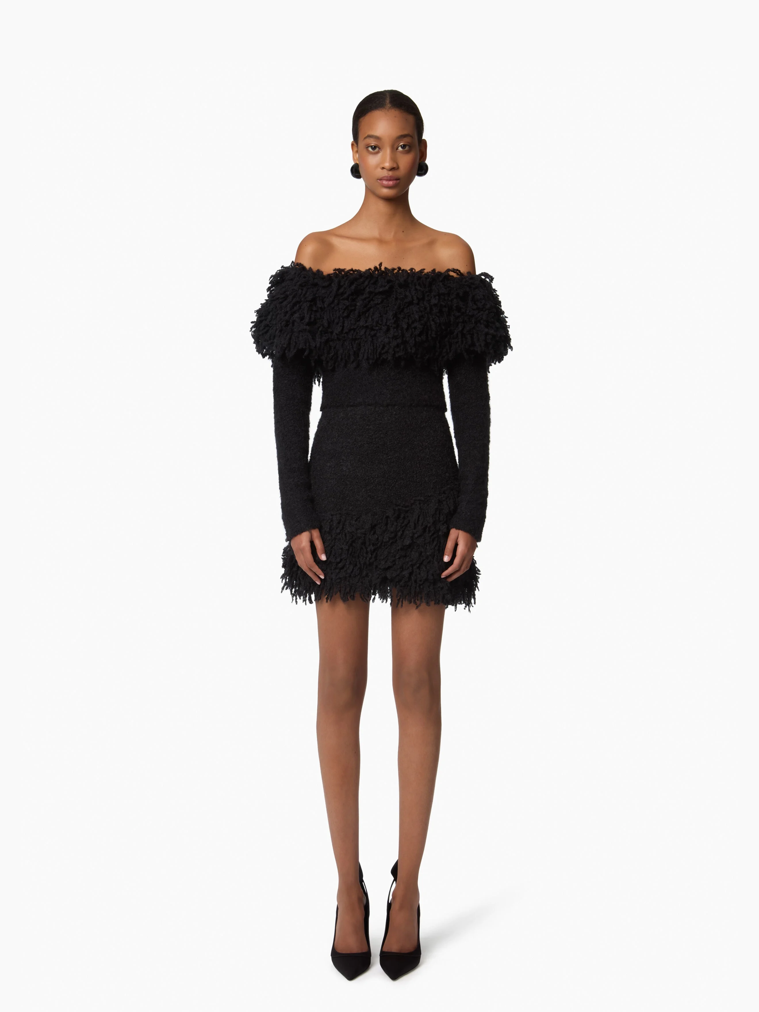 This black mini skirt is crafted in a textured wool-alpaca blend knit and finished with a soft boucle trim that adds dimension and movement to the silhouette. Cozy yet bold, it’s designed to be worn with the matching top for a strong, coordinated look. COMPOSITION & DETAILS - 68% wool, 32% alpaca. - Fitted cut. - Mini length. - Boucle trim finish. - Model is 180 cm/ 5ft 11in and wears a size S. - Ref: 25AMJU006ML0588U9000