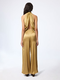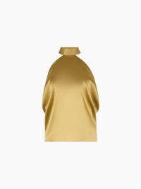 This gold silk satin halterneck top stands out with its fluid elegance and daring silhouette. The open back reveals the skin with refined subtlety, perfect for an evening look that’s both discreet and confidently bold. COMPOSITION & DETAILS - 94% silk 6% elastane. - Backless. - Model is 180 cm/ 5ft 11in and wears size 38 (FR). - Ref: 26PCTO002SE1415U6139