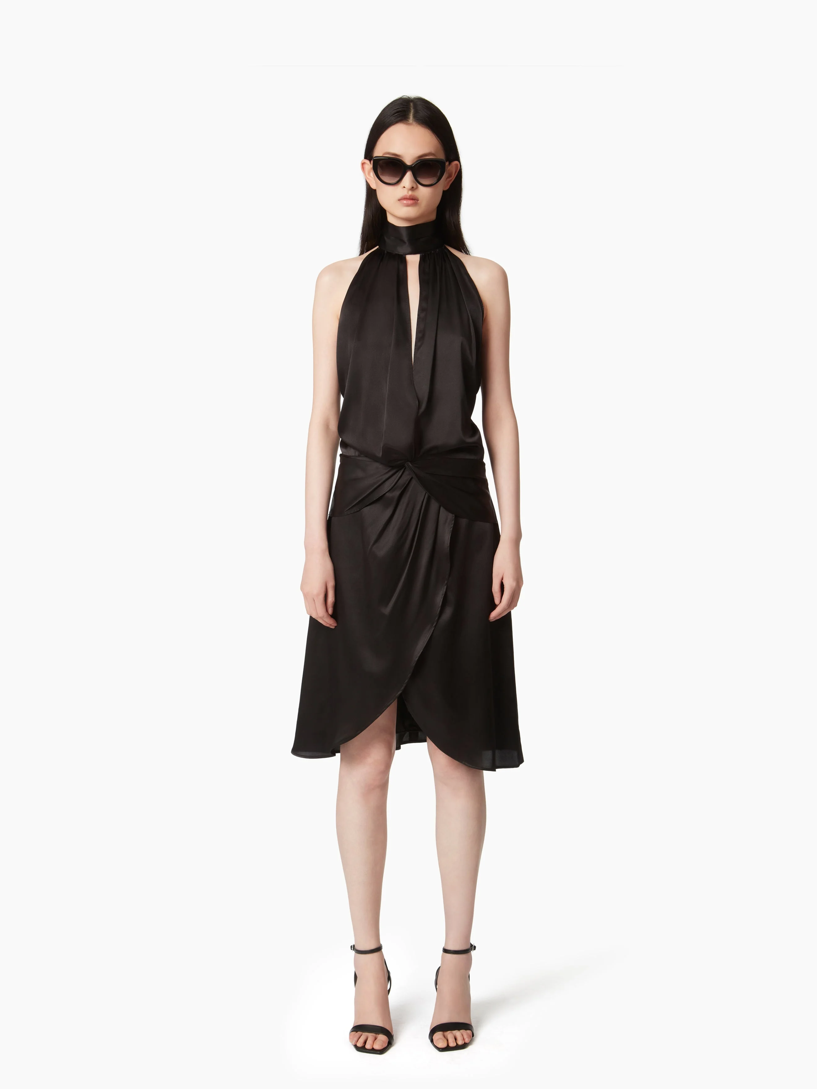 This black stretch satin halter-neck dress features Nina Ricci's signature bow at the front. Its American neckline adds fluidity and elegance to the silhouette. COMPOSITION & DETAILS - 52% viscose, 37% silk, 11% elastane. - Fitted cut. - Knee-length. - American neckline. - Button closure around neck. - Model is 182 cm and wears a size 36 (FR). - Ref : 25PCRO018VI0530U9000