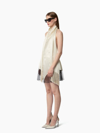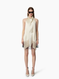 This creme satin halterneck top stands out with its fluid elegance and daring silhouette. It features a removable long tasselled scarf that can be tied or left to fall freely. The open back reveals the skin with refined subtlety—perfect for an evening look that’s both discreet and confidently bold. COMPOSITION & DETAILS - 52% viscose, 37% silk, 11% elastane. - Regular fit. - Removable fringe scarf. - Open back. - Fastens at the back with two concealed buttons. - Model is 178 cm / 5ft 10in and wears a size 36 (FR). - Ref: 25ACTO022VI0530U1230