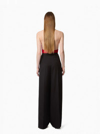 This vivid red satin halterneck top stands out with its fluid elegance and daring silhouette. It features a removable long tasseled scarf that can be tied or left to fall freely. The open back reveals the skin with refined subtlety—perfect for an evening look that’s both discreet and confidently bold. COMPOSITION & DETAILS - 52% viscose, 37% silk, 11% elastane. - Regular fit. - Removable fringe scarf. - Open back. - Fastens at the back with two concealed buttons. - Model is 178 cm / 5ft 10in and wears a size 36 (FR). - Ref: 25ACTO022VI0530U2136