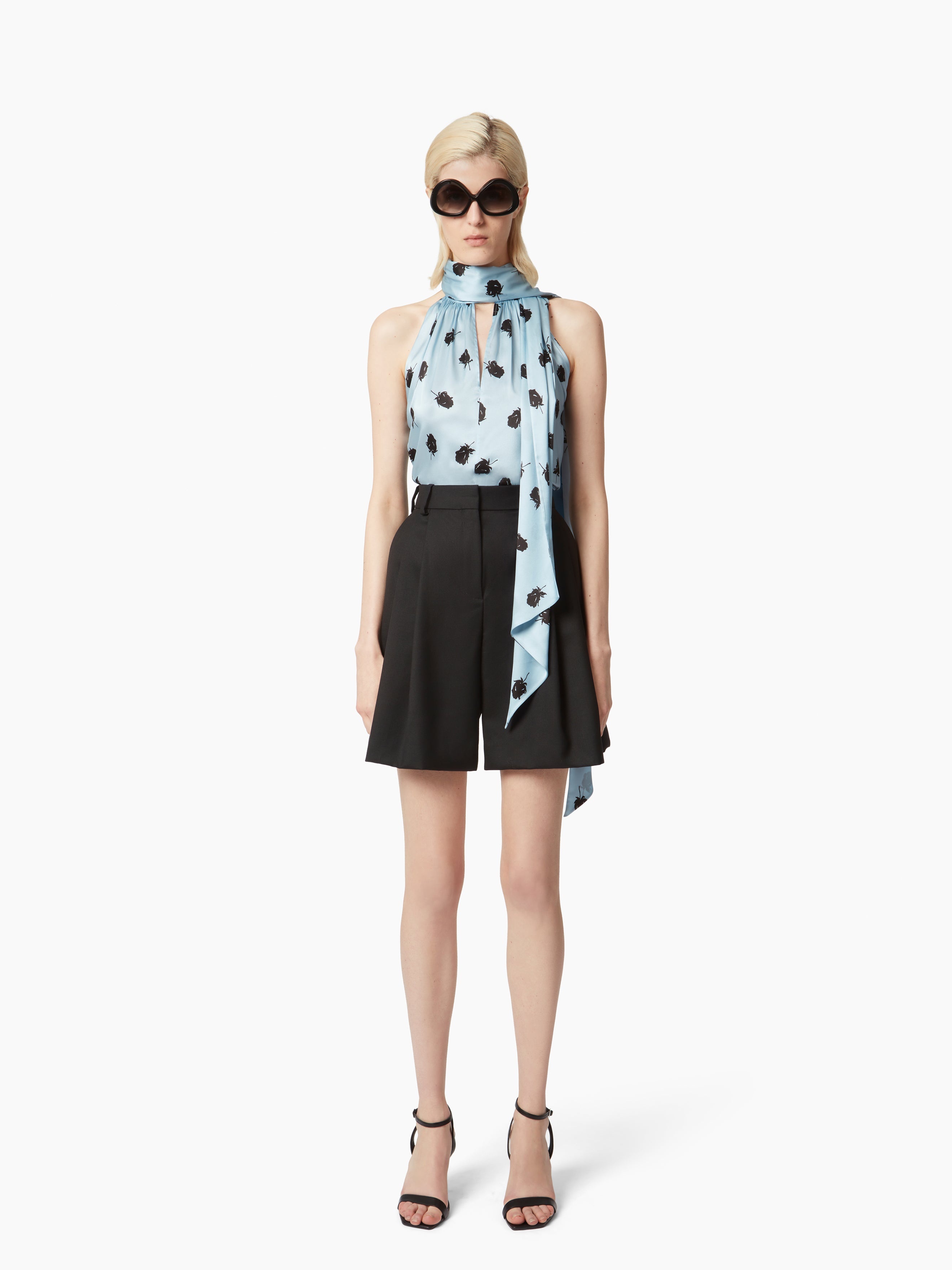 Emblematic of the Nina Ricci silhouette, the lavalliere embodies timeless elegance. Harris Reed revisits it each season with unique variations. Here, in fluid satin printed with black roses and a halterneck, the lavalliere top offers fluidity and refined elegance to the silhouette. COMPOSITION & DETAILS - 52% viscose, 37% silk, 11% elastane. - Slim fit. - American neckline. - Model is 181 cm and wears a size 36 (FR). - Ref : 25PCTO010VI0531I4050