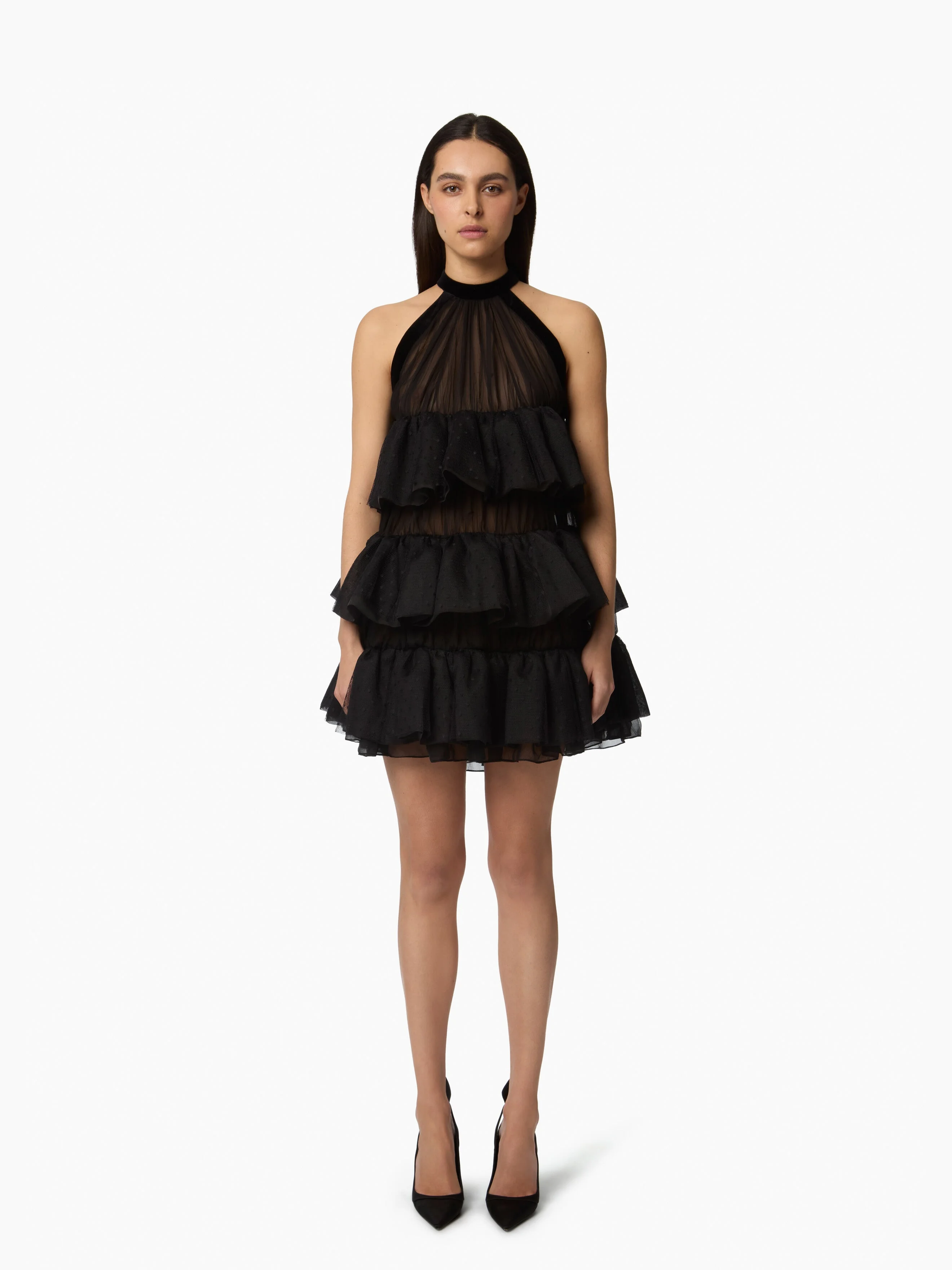 This black sleeveless mini dress in crinkled silk chiffon charms with its sheer effect and airy volume. Adorned with delicate lace ruffles, it sketches a weightless silhouette. The halter neckline enhances the shoulder line, while the open wrap-back with bow detail adds structure and a contemporary finish to this resolutely couture evening piece. COMPOSITION & DETAILS - 100% silk. - Loose fit. - Mini length. - Halter neckline. - Open wrap-back with bow detail. - Model is 180 cm/ 5ft 11in and wears a size 36 (FR). - Ref: 25ACRO054SE1400U9000.