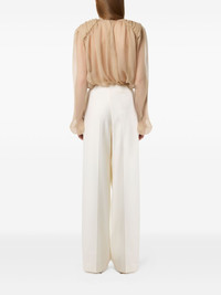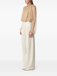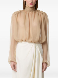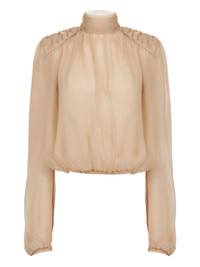 high-neck puffed-sleeve top Highlights - Beige - High neck - Puffed sleeves - Long sleeves - Gathered shoulders - Crinkled silk Imported Composition Silk 100%, Cupro 100% Washing instructions Dry Clean Only