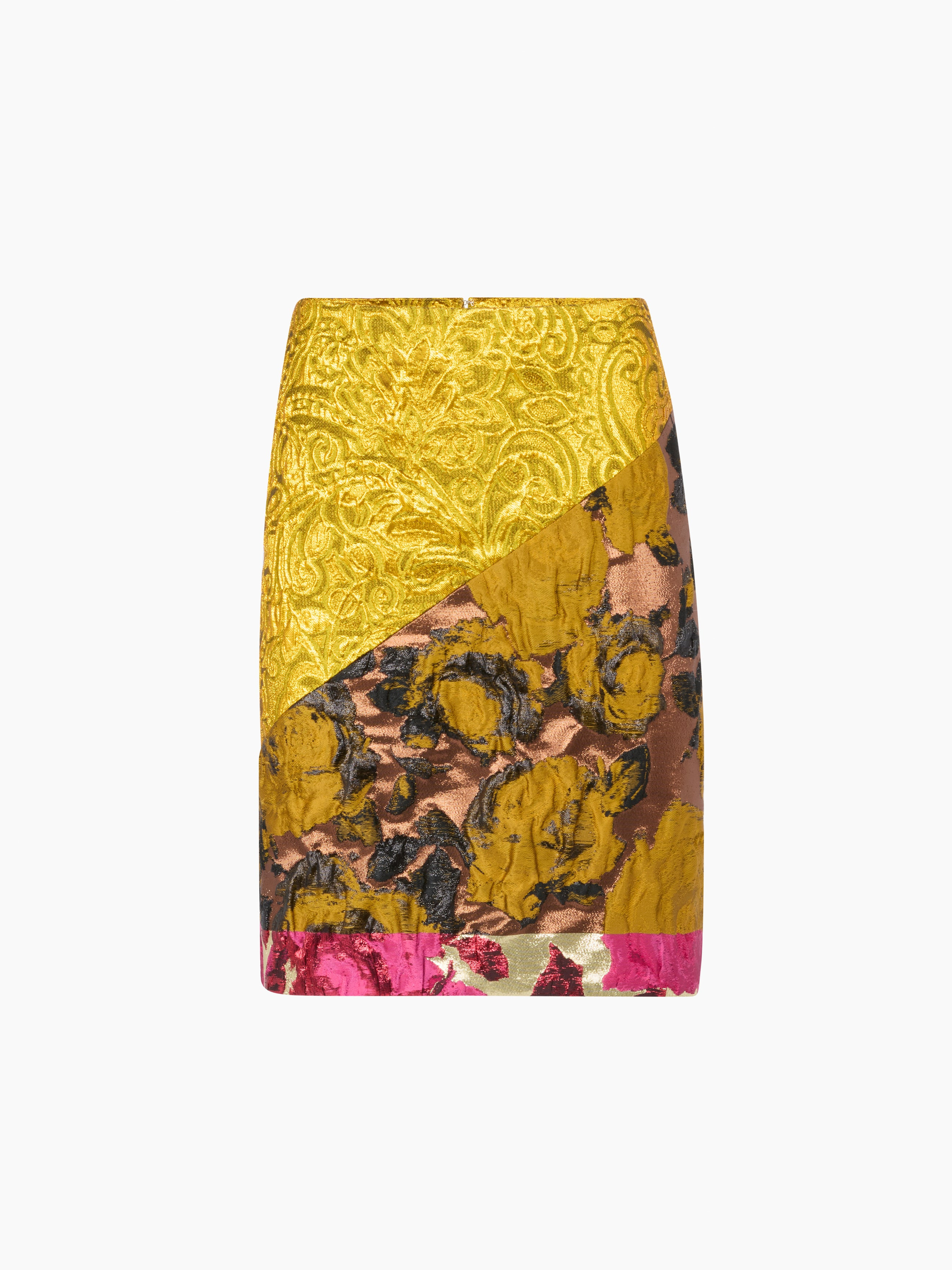 A standout silhouette for Spring-Summer 2026, this midi skirt fuses couture craftsmanship with expressive printwork. Its asymmetric patchwork composition combines golden jacquard, rich florals, and flashes of fuchsia in a striking visual dialogue. Both opulent and graphic, it reflects the theatrical energy that defines Harris Reed’s vision for Nina Ricci. COMPOSITION & DETAILS - 84% polyester 14% metallic polyester 2% polyamide. - Straight cut. - Model is 179 cm/ 5ft 10in and wears size 38 (FR). - Ref: 26PCJU029PL0505M1457