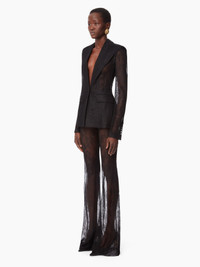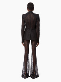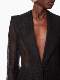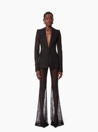 Emblematic of the Nina Ricci silhouette, Harris Reed adapts and reinterprets the suit each season. A new addition for the Fall-Winter 2024 collection, this blazer in chantilly lace features a slim fit, a single button fastening, and a wide collar. The transparency of the lace highlights the femininity of this piece. Paired with tailored pants from the collection, the total look is signature Nina Ricci. Fitted waist. Take your regular size. COMPOSITION & DETAILS - 74% polyamide, 26% viscose. - Slim fit. - Single-button closure. - Wide collar with pointed lapels. - Unlined. - 2 flap pockets. - Model is 180 cm and wears a size 36 (FR). - Ref : 24ACVE019PA0492U9000