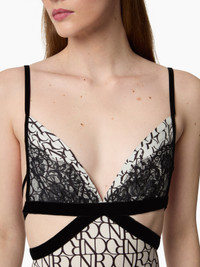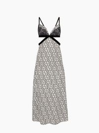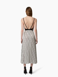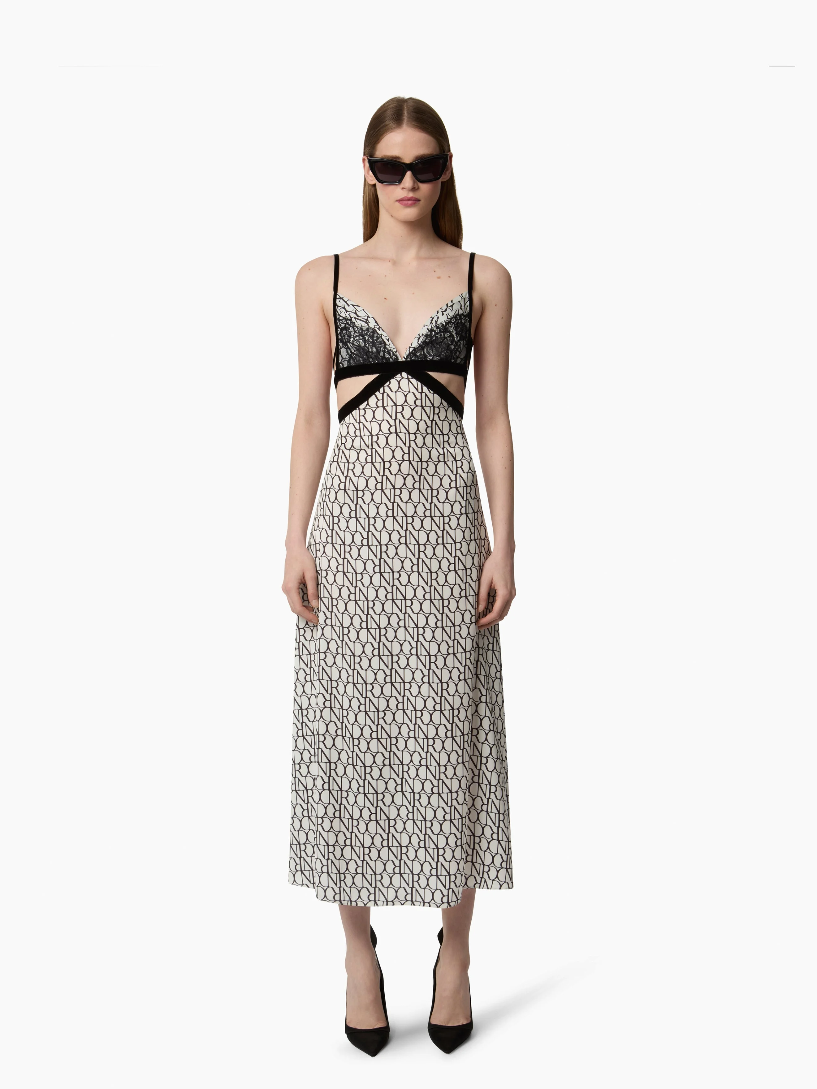 This midi dress with fine straps blends modernity and sensuality. Crafted from lightweight chiffon, it features the exclusive Nina Ricci logo print for the Autumn-Winter 2025 season. Its fitted silhouette is enhanced by a series of cut-outs that structure the waist, accentuated with black satin inserts. A delicate lace-trimmed V-neckline adds a romantic touch, creating a look that is both bold and refined. COMPOSITION & DETAILS - 100% polyester. - Fitted cut. - Midi length. - Fine straps. - V-neckline. - Open back. - Waist cut-out detailing. - Model is 180 cm/ 5ft 11in and wears a size 36 (FR). - Ref: 25ACRO042PL0485I1215.
