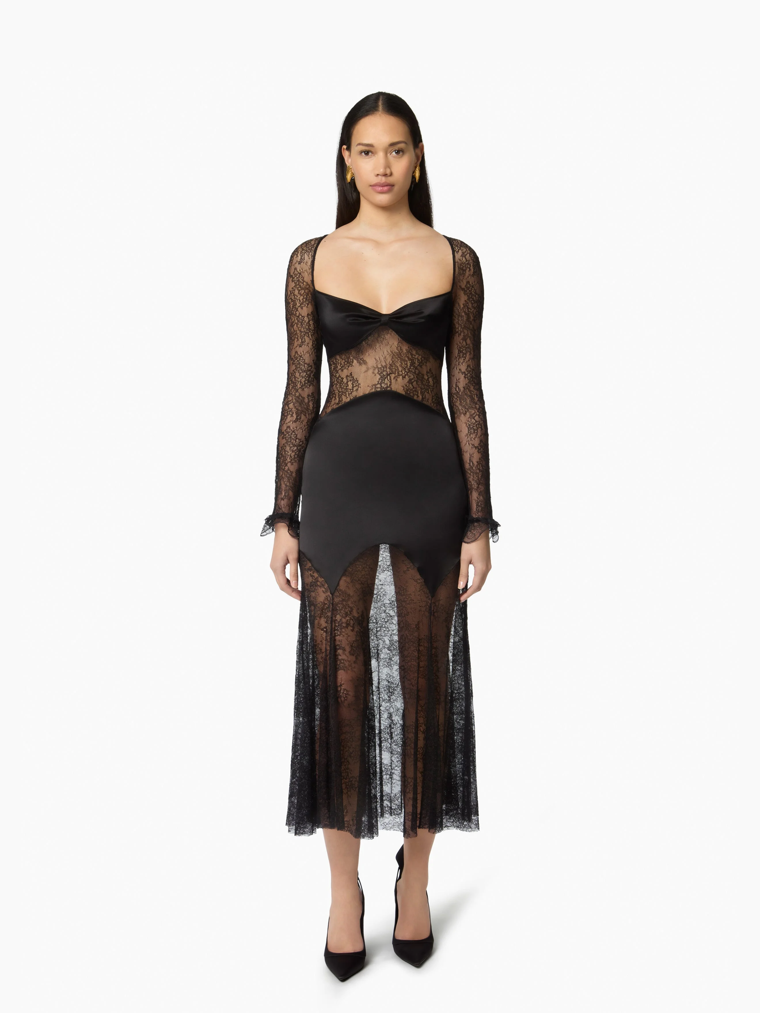 This long black dress in sheer lace and satin blends sensuality with sophistication. Featuring long lace sleeves and an open back, it reveals the silhouette with subtle elegance. The structured satin bodice highlights the waist, while the play of transparency through the skirt and sleeves creates a bold, graphic effect. COMPOSITION & DETAILS - 74% polyamide, 26% viscose. - Fitted cut. - Midi length. - Sweetheart neckline. - Model is 178 cm/ 5ft 10in and wears a size 36 (FR). - Ref: 25ACRO033PA0492U9000