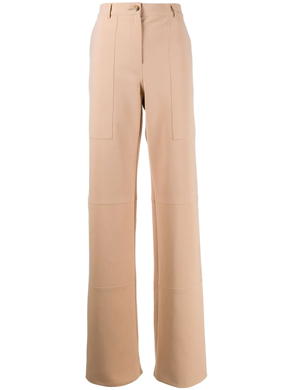 long wide-leg trousers Beige long wide-leg trousers from Nina Ricci featuring a high rise, a waistband with belt loops, a button & zip fastening, side slit pockets and two back patch pockets. Imported Composition Viscose 72%, Spandex/Elastane 28% Washing instructions Dry Clean Only