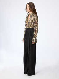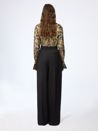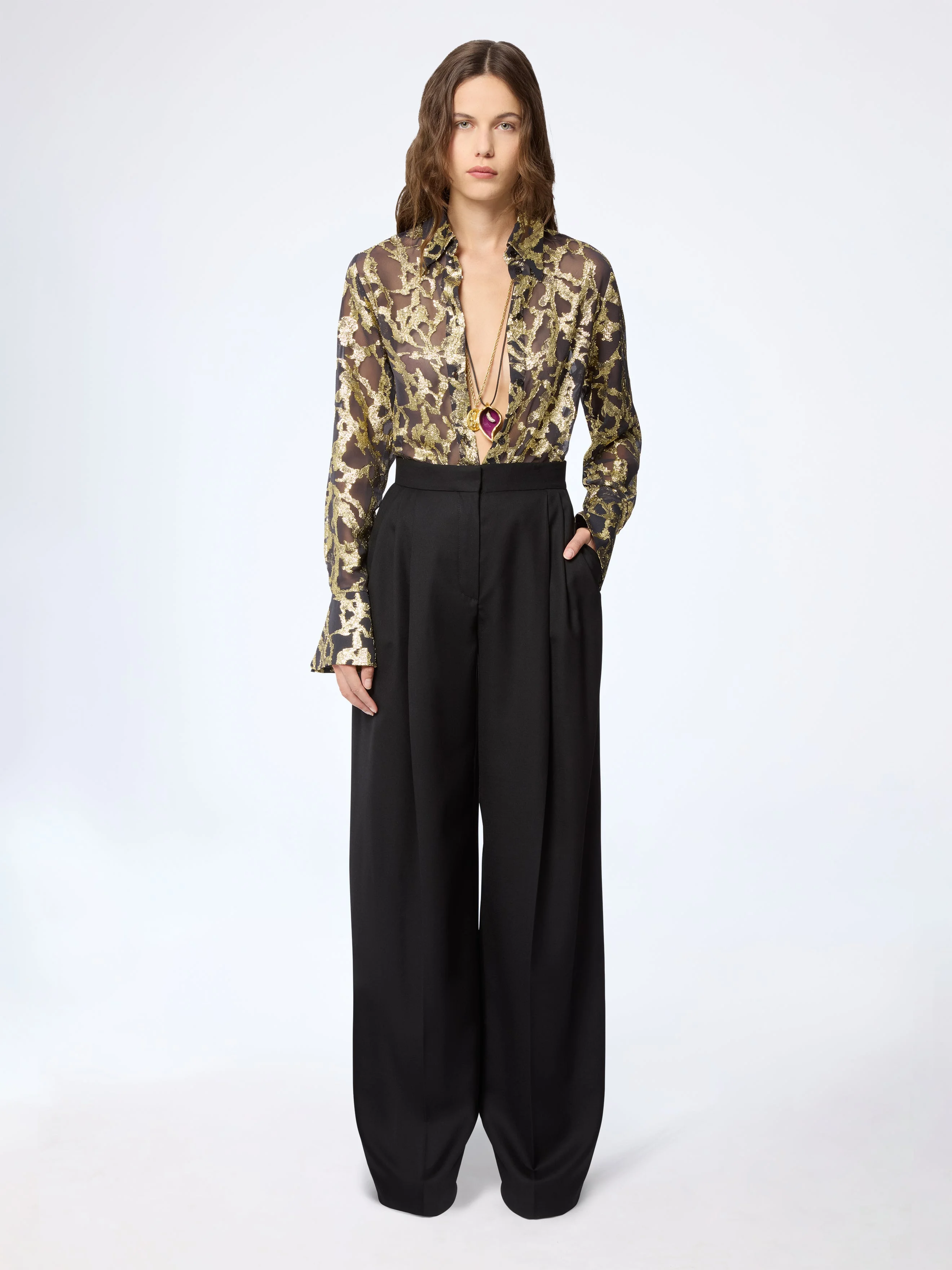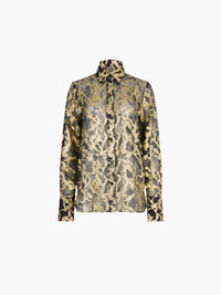Printed with a marbled gold motif, this sheer silk shirt plays on light and transparency. Its fluid volume is punctuated by flared bell cuffs and a sharp collar, offering a balance between softness and structure. COMPOSITION & DETAILS - 56% silk 44% metallic polyester. - Bell cuffs. - Ref: 26PCTO007SE1420M9113