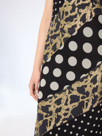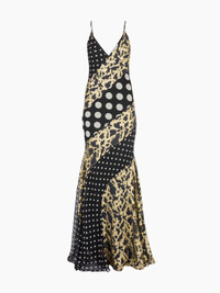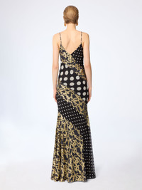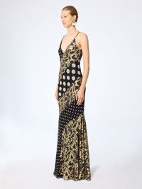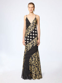 An emblematic silhouette of the Spring-Summer 2026 collection, this long silk dress plays with scale and rhythm through a patchwork of marbled gold. Cut on the bias for graceful movement, it features a plunging neckline and diagonal lace inserts that contour the body with graphic elegance. COMPOSITION & DETAILS - 56% silk 44% metallic polyester. - Lined with a dress. - Maxi length. - Model is 180 cm/ 5ft 11in and wears size 36 (FR). - Ref: 26PCRO073SE1420M9113