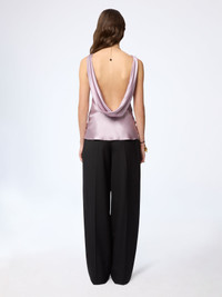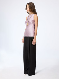 This halterneck top in mauve silk satin captures the house’s signature duality with its sculptural neckline and subtle draping that glides across the body. Both minimal and sensuous, it reinterprets classic Parisian codes through the lens of bold self-expression. A refined silhouette that reflects Nina Ricci’s evolving femininity under the creative direction of Harris Reed. COMPOSITION & DETAILS - 94% silk 6% elastane. - Boat neck. - Backless. - Model is 179 cm/ 5ft 10in and wears size 36 (FR). - Ref: 26PCTO011SE1415U2671