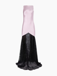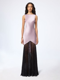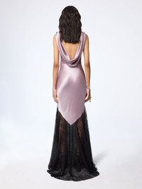 Emblematic of the Nina Ricci silhouette, the long mermaid halter dress embodies femininity and timeless elegance. For Spring-Summer 2026, Harris Reed reinterprets it in lilac silk satin with sheer sophistication for a subtle interplay of materials. COMPOSITION & DETAILS - 94% silk 6% elastane. - Slim fit. - Maxi length. - Boat neck. - Backless. - Model is 180 cm/ 5ft 11in and wears size 36 (FR). - Ref: 26PCRO067SE1415U2671