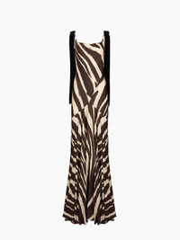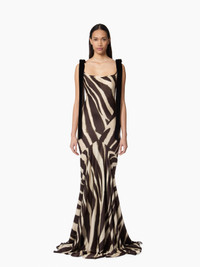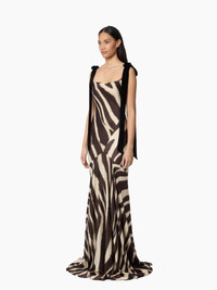 This long mermaid-cut dress is crafted from fluid satin, featuring a zebra print exclusive to the Autumn-Winter 2025 collection. A signature silhouette of Nina Ricci, its bias-cut construction sculpts and elongates the body with elegance. For the season, Harris Reed reimagines it with daring flair, accenting the shoulders with two long velvet bows for a refined finish. COMPOSITION & DETAILS - 74% polyamide, 26% viscose. - Mermaid cut. - Maxi length. - Straight neckline. - Velvet shoulder bows. - Model is 178 cm/ 5ft 10in and wears a size 36 (FR). - Ref: 25ACRO029VI0540I1308