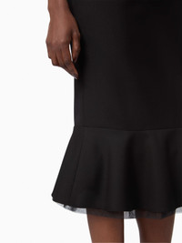 This midi skirt with a flounced peplum, crafted from black wool gabardine, sculpts the silhouette with elegance. Its fitted shape flares gently at the hem to create a controlled volume that’s both feminine and graphic. Designed for the Fall-Winter 2025 collection, it embodies the refined sophistication true to Nina Ricci’s couture spirit. COMPOSITION & DETAILS - 100% virgin wool. - Midi length. - Invisible zip fastening at the back. - Double tulle flounce. - Model is 180 cm/ 5ft 11in and wears a size 36 (FR). - Ref: 25ACJU014WV0324U9000