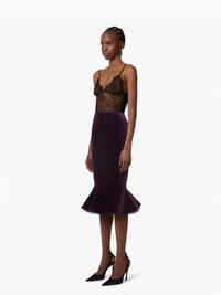 This purple velvet midi skirt stands out with its fitted silhouette, enhanced by a flounced peplum that adds subtle, sculptural movement. Its rich, luminous texture brings a refined, precious touch to the silhouette. Part of the Fall-Winter 2025 collection, it embodies the sophisticated couture spirit of the Maison Nina Ricci. COMPOSITION & DETAILS - 100% cotton. - Midi length. - Invisible zip fastening at the back. - Double ruffle tulle. - Model is 180 cm/ 5ft 11in and wears a size 36 (FR). - Ref: 25ACJU014CO1092U3342