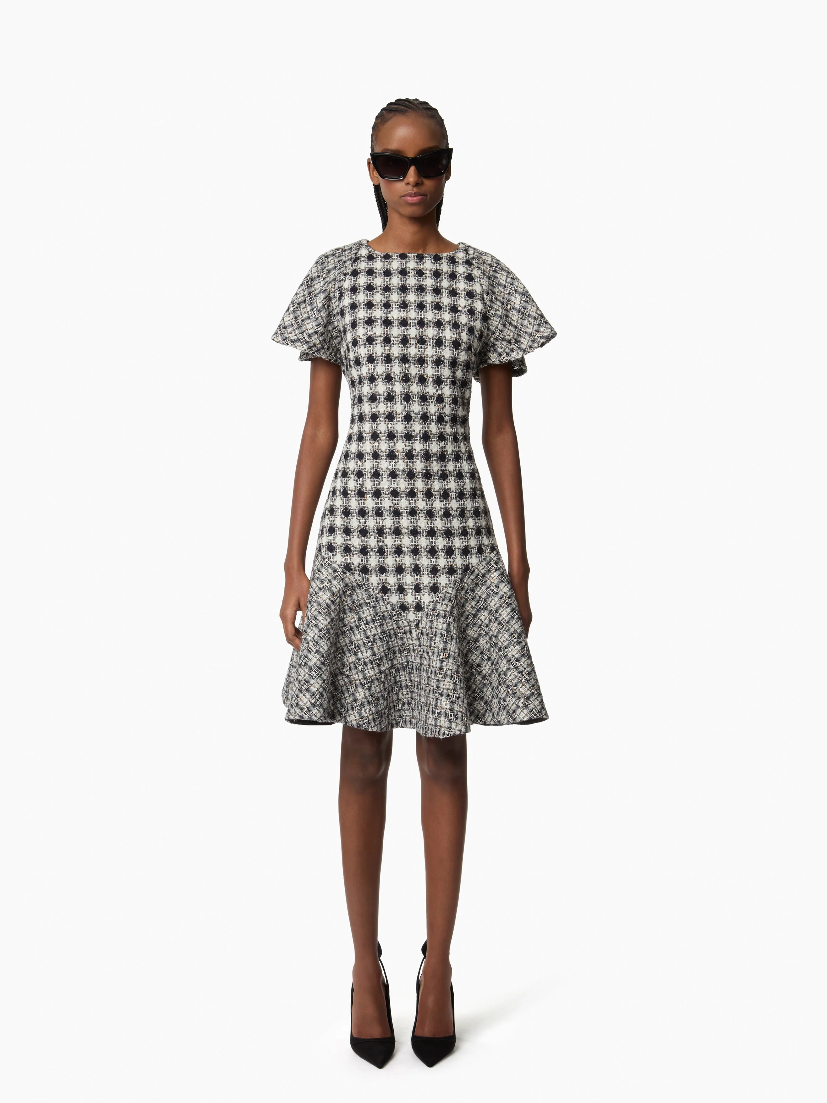 This black and white midi dress with short sleeves plays with contrasting textures, thanks to its double-faced tweed that reveals two distinct yet complementary patterns. Its structured cut flares subtly at the hem, creating a feminine and assertive silhouette. A sophisticated piece that embodies the contemporary elegance so dear to the Maison Nina Ricci. COMPOSITION & DETAILS - 33% wool, 25% polyester, 21% acrylic, 9% viscose, 8% polyamide, 4% lurex. - Straight cut. - Midi length. - Round neckline. - Model is 178 cm/ 5ft 10in and wears a size 36 (FR). - Ref: 25ACRO049WO0362M1331