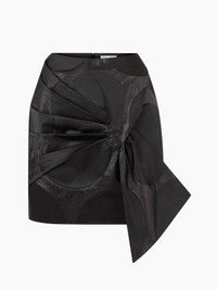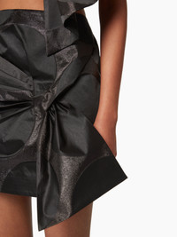Crafted in black lurex jacquard with polka dots, this mini skirt plays on material effects and features a bow detail at the front for a bold look. COMPOSITION & DETAILS - 65% recycled polyester, 35% polyester. - High waist. - Mini length. - Invisible zip closure at back - Bow detail at front - Model is 180 cm and wears a size 36 (FR). - Ref : 25PCJU023PL0471U9000