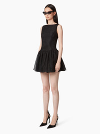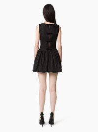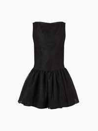 According to Nina Ricci, this sleeveless dress, fitted at the waist and featuring a flared basque, is crafted in chantilly lace and perfectly embodies feminine elegance. The back is adorned with three delicate bows, an emblematic signature of the Maison. COMPOSITION & DETAILS - 74% polyamide, 26% viscose. - Slim fit. - Mini length - Boat neck. - Back closed with 4 velvet bows. - Model is 182 cm and wears a size 36 (FR). - Ref : 25PCRO042PA0492U9000