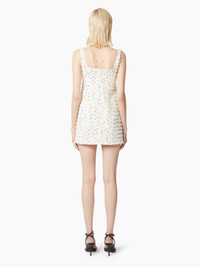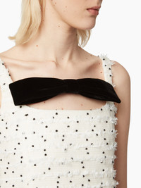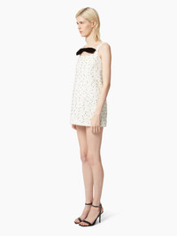 Harris Reed rethinks the mini dress in cream tweed with polka dots, enhanced by a square neckline and a contrasting bow, a symbol of the Maison Nina Ricci, on the chest. COMPOSITION & DETAILS - 75% wool, 17% polyamide, 7% polyester. - Slim fit. - Mini length - Square neckline. - Contrasting bow detail on chest. - Invisible zip fastening at back. - Model is 181 cm and wears a size 36 (FR). - Ref : 25PCRO038WO0357M1244