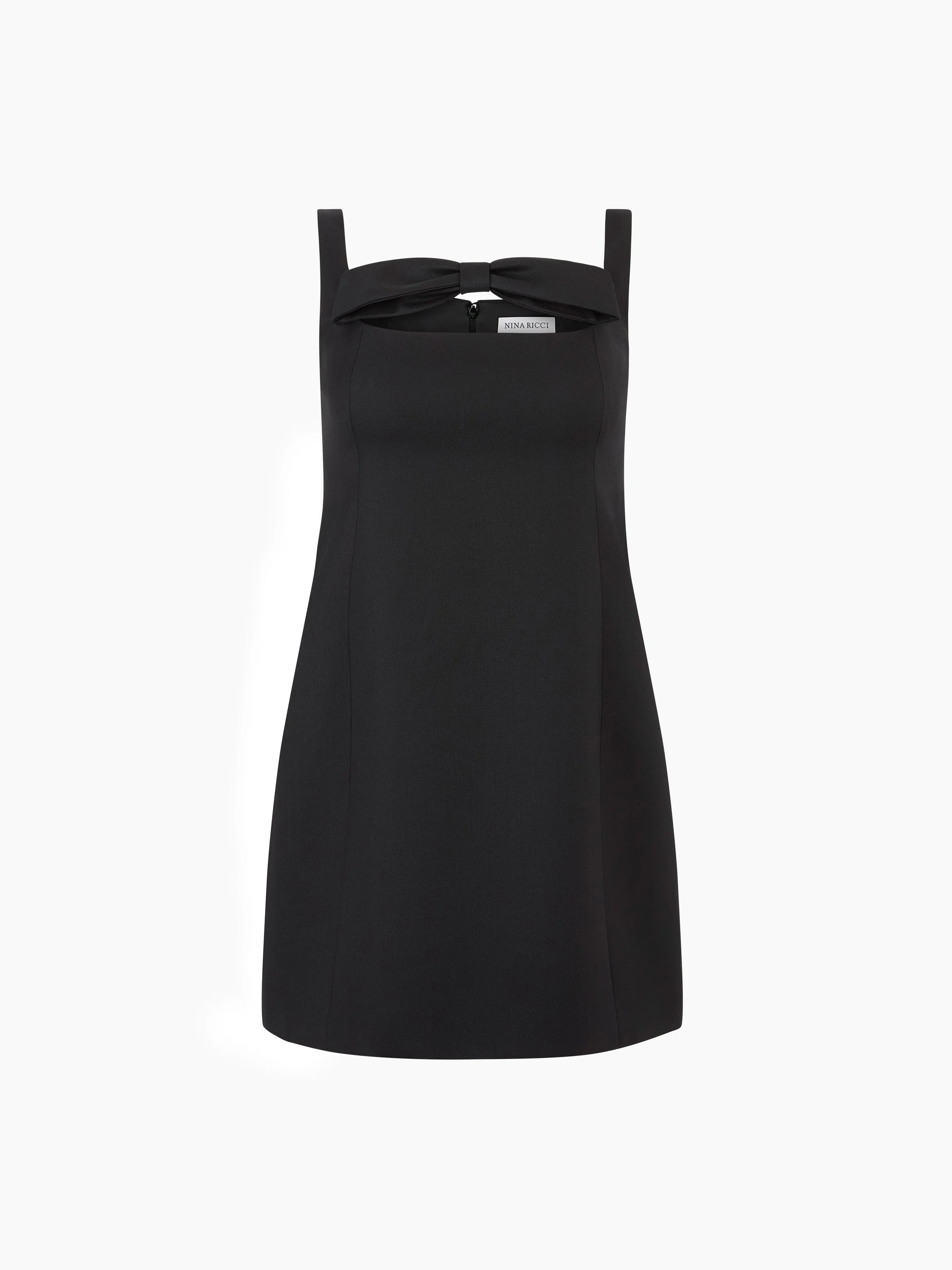 Harris Reed rethinks the mini-dress in a black virgin wool gabardine sublimated by a square neckline and a bow, a symbol of the Maison Nina Ricci, on the chest. COMPOSITION & DETAILS - 100% ethical virgin wool. - Slim fit. - Mini length - Square neckline. - Bow detail on chest. - Invisible zip closure at back. - Model is 181 cm and wears a size 36 (FR). - Ref : 25PCRO038WV0322U9000