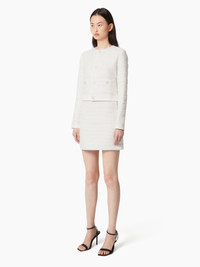 This mini skirt blends cream tweed and denim for a daring marriage of materials. Wear it with the matching cardigan for a total Nina Ricci look or with jeans for a more casual look. COMPOSITION & DETAILS - 23% viscose, 15% polyester, 11% polyamide. - Mini cut. - Model is 182 cm and wears a size S. - Ref : 25PMJU003ML0578U1230