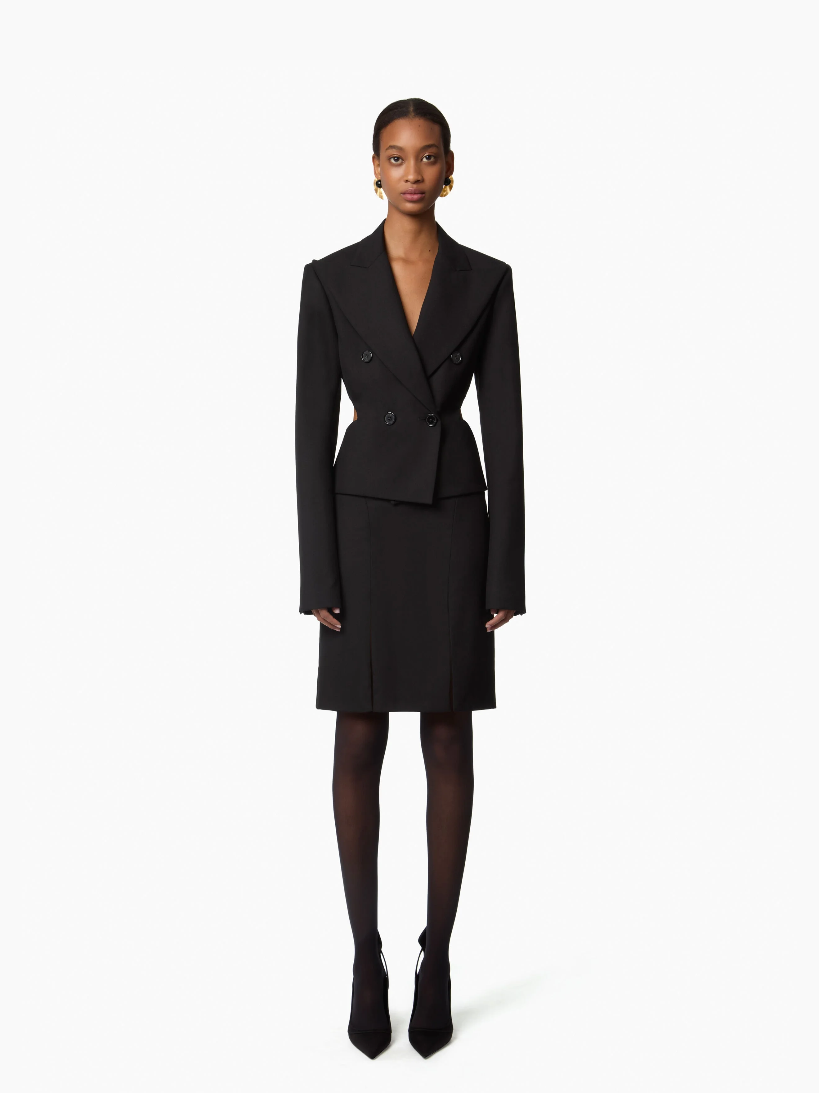 This black wool mini skirt updates a timeless wardrobe classic with subtle modernity. Its tailored fit highlights the silhouette, while two front slits bring structure and movement. A key piece in the Fall-Winter 2025 collection, it reflects the refined elegance and precise tailoring that define Maison Nina Ricci.