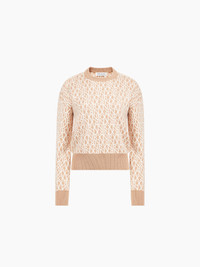 Crafted in double-faced jacquard intarsia, this crewneck sweater features the iconic NR monogram in cream on white, a signature of the Nina Ricci wardrobe. The precise finish is as refined on the inside as it is on the outside, reflecting the Maison's attention to detail. Ribbed trims at the neckline, cuffs, and waist subtly shape the silhouette while ensuring a comfortable fit. COMPOSITION & DETAILS - 86% wool, 10% cashmere, 3% polyamide, 1% elastane. - Regular fit. - Crew neckline. - All-over NR monogram. - Contrast ribbing at collar, cuffs, and hem. - Model is 178 cm/ 5ft 10in and wears a size S. - Ref: 25AMPU016ML0587M1452