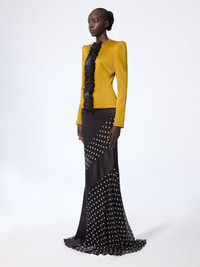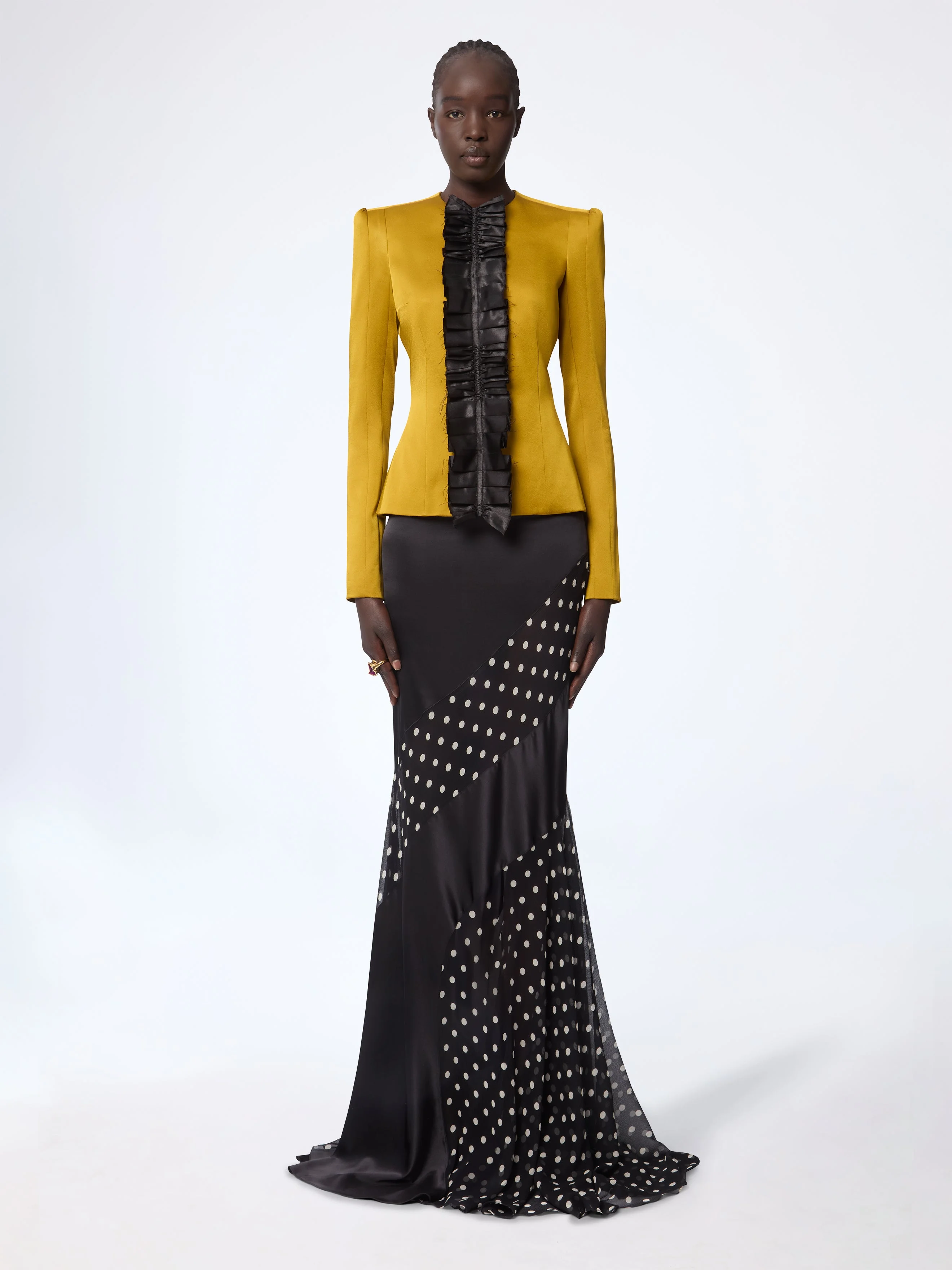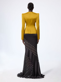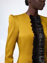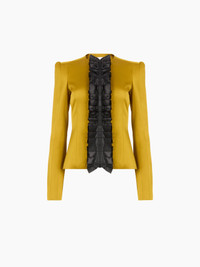 This tailored jacket is part of the Spring-Summer 2026 collection. Cut in a saturated mustard tone, it features a sculpted silhouette and a contrasting front panel in ruched black fabric. The precise construction draws the eye to the centre line, enhancing both volume and tension. COMPOSITION & DETAILS - 74% acetate 26% viscose. - Fitted cut. - Model is 180 cm/ 5ft 11in and wears size 36 (FR). - Ref: 26PCVE020AC0125U6139