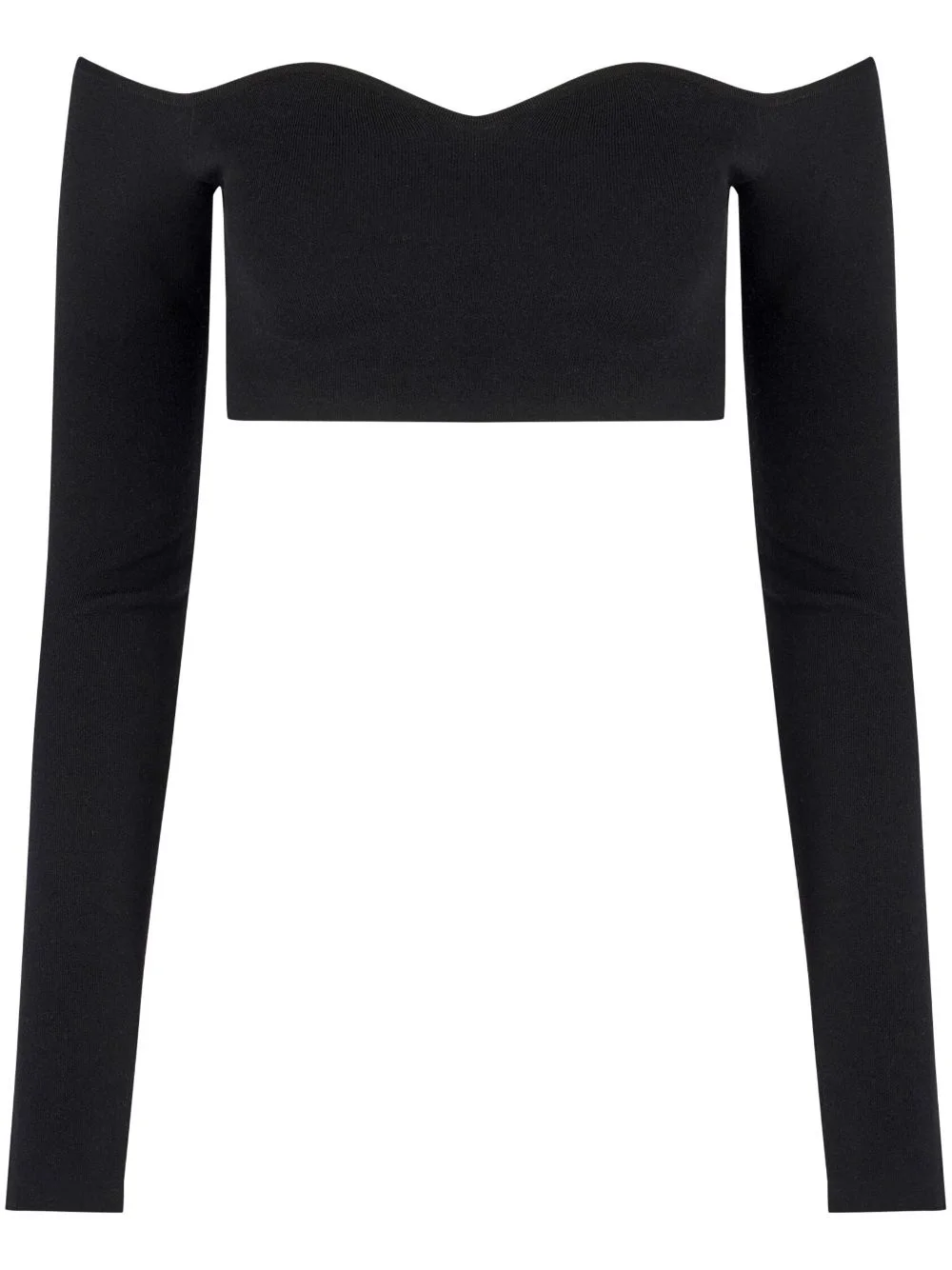 off-shoulder cropped top Highlights - Black - Wool blend - Off-shoulder - Long sleeves - Straight hem - Cropped Imported Composition Wool 83%, Polyester 17% SIZE & FIT Measurement SLEEVE LENGTH 20.07 in(51 cm) LENGTH 11.02 in(28 cm) WAIST 29.13 in(74 cm) BUST 32.28 in(82 cm)