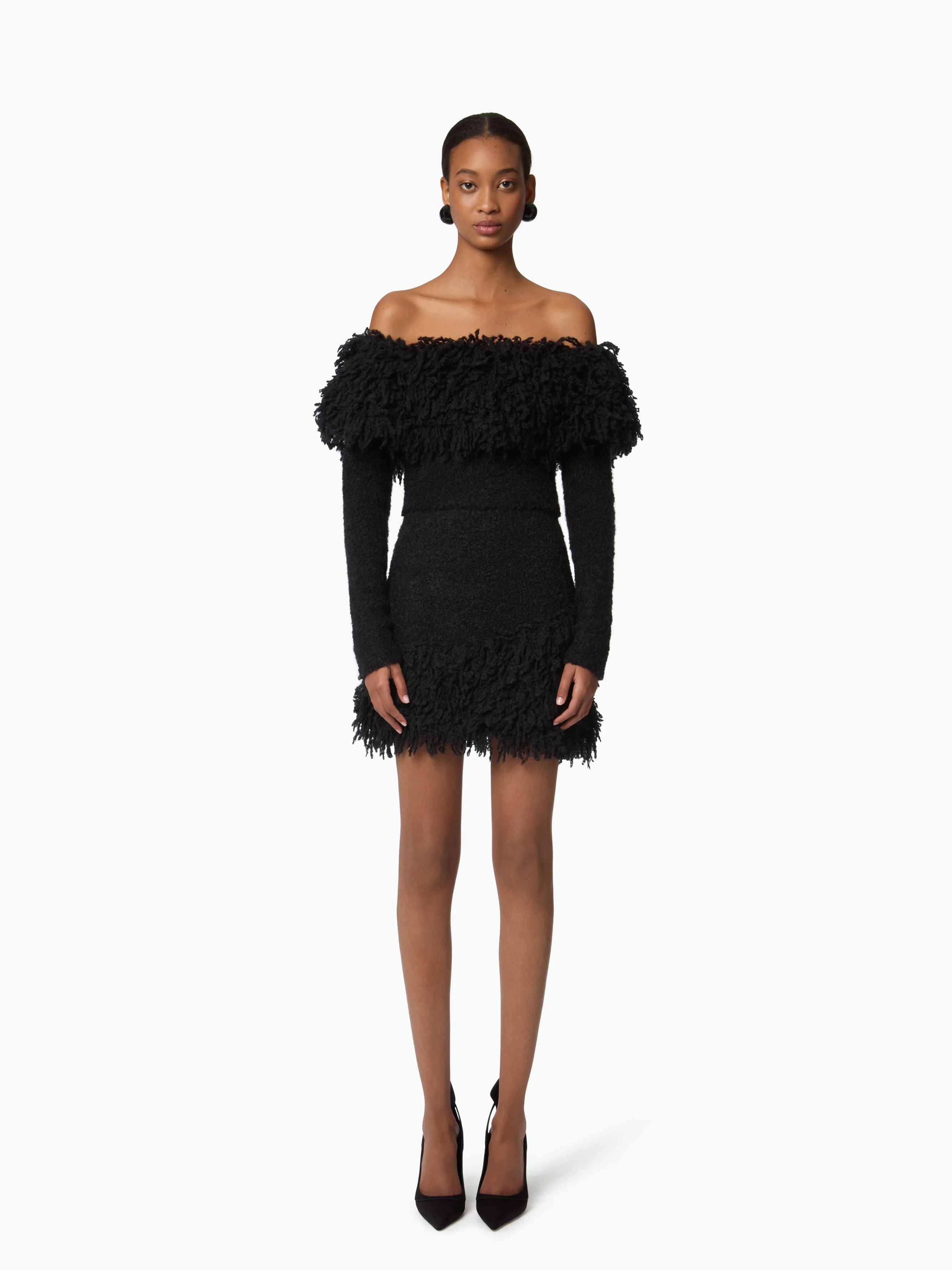 Crafted in a textured knit, this black sweater in a wool and alpaca blend stands out with its bardot neckline and soft boucle trim tracing the shoulder line. Both cozy and refined, it's the perfect piece for a strong, sophisticated silhouette. COMPOSITION & DETAILS - 68% wool, 32% alpaca. - Fitted cut. - Bardot neckline. - Boucle trim along the shoulders. - Model is 180 cm/ 11ft and wears a size S. - Ref: 25AMPU014ML0588U9000