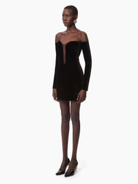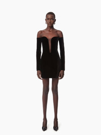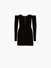 Introducing a new piece from the Fall-Winter 2024 collection, this corset dress crafted from radiant, fluid velvet showcases a deep plunging V-neckline, exposed shoulders, and a cinched waist to accentuate the silhouette curves. Fitted. If you are between 2 sizes, take 1 size up. COMPOSITION & DETAILS - 50% rayon, 50% cupro. - Slim fit. - Mini length. - Deep V-neckline in transparent tulle. - Long sleeves. - Bare shoulders. - Gold-tone zipper and hook-and-eye closure at back. - Model is 180 cm and wears a size 36 (FR). - Ref : 24ACRO030RA0044U9000