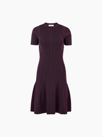 Crafted in fitted purple knit, this mid-length dress with short sleeves and a round neck features couture cutouts and a flared finish. COMPOSITION & DETAILS - 100% viscose. - Slim fit. - Round collar. - Short sleeves. - Flared underskirt. - Model is 182 cm tall and wears a size S. - Ref : 25PMRO003ML0569U3342