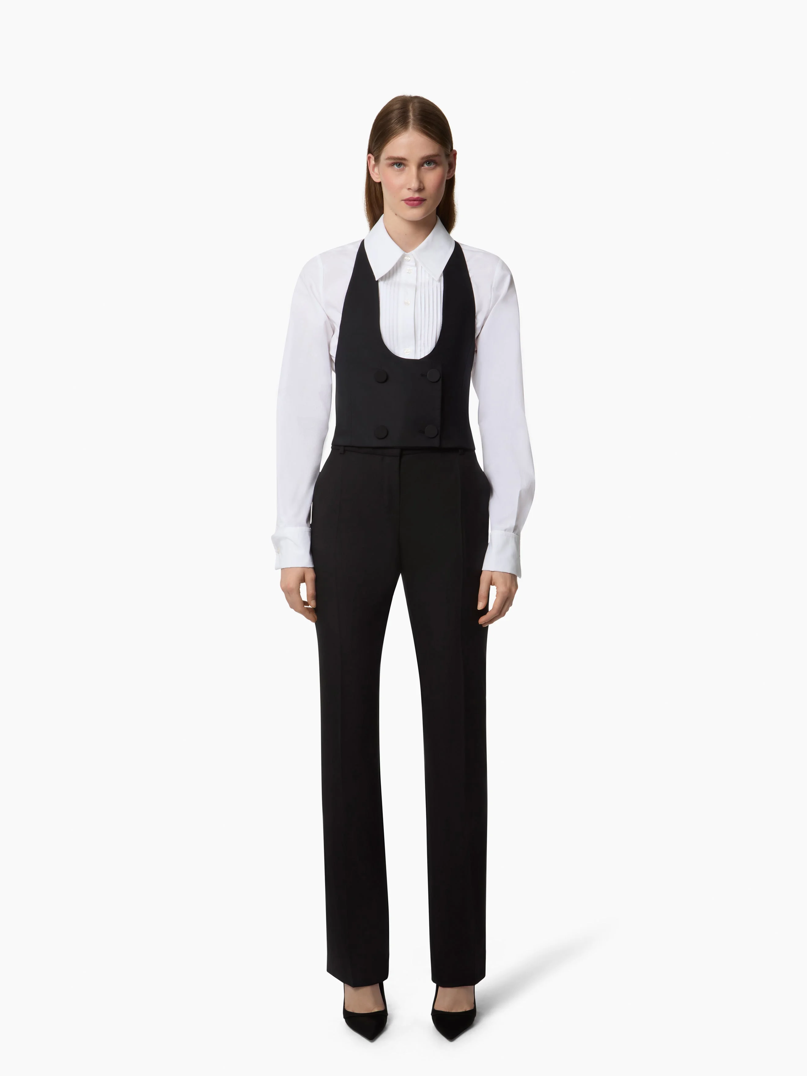 This white shirt in organic cotton poplin stands out for its lightness and timeless straight-cut silhouette. Highlighted by a pleated bib—an iconic Nina Ricci detail—it brings a refined tailoring spirit to the Autumn-Winter 2025 collection. French cuffs elevate the look with an extra touch of sophistication, echoing the suit-inspired codes that run throughout the season. COMPOSITION & DETAILS - 100% organic cotton. - Tailored fit. - Pleated bib on the front. - Pointed French collar. - French cuffs. - Model is 178 cm/ 5ft 10in and wears a size 35 (FR). - Ref: 25ACTO033CO1077U1000.