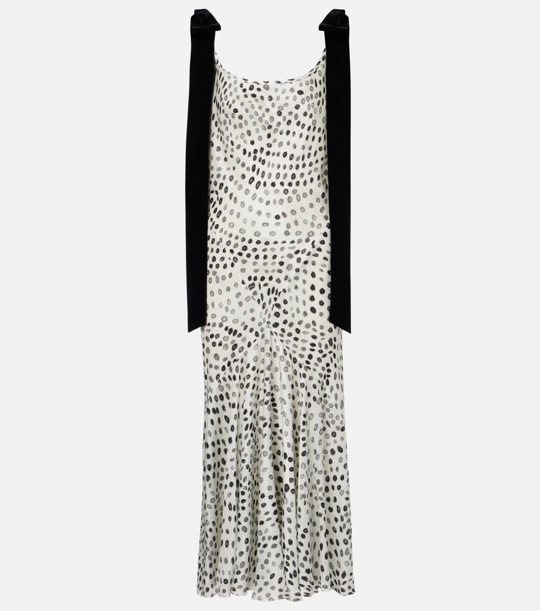 A skillful play of structure and proportion ensures the house of Nina Ricci remains a tastemaker for Parisian style. Cut on the bias from silk-infused satin, this midi dress is defined by a distinctive polka-dot pattern and velvet bows at the shoulders. Product Details - Material: 70% viscose, 30% silk - Care instructions: dry clean - Made in Poland - Color: white - Designer color name: Acqua Polka - Details: 100% polyamide - Item number: P01141676 Size & Fit - True to size - Low back - Cinched waist - Non-stretchy fabric - The model seen in the picture is 178cm-5'10" and wearing a size FR 36