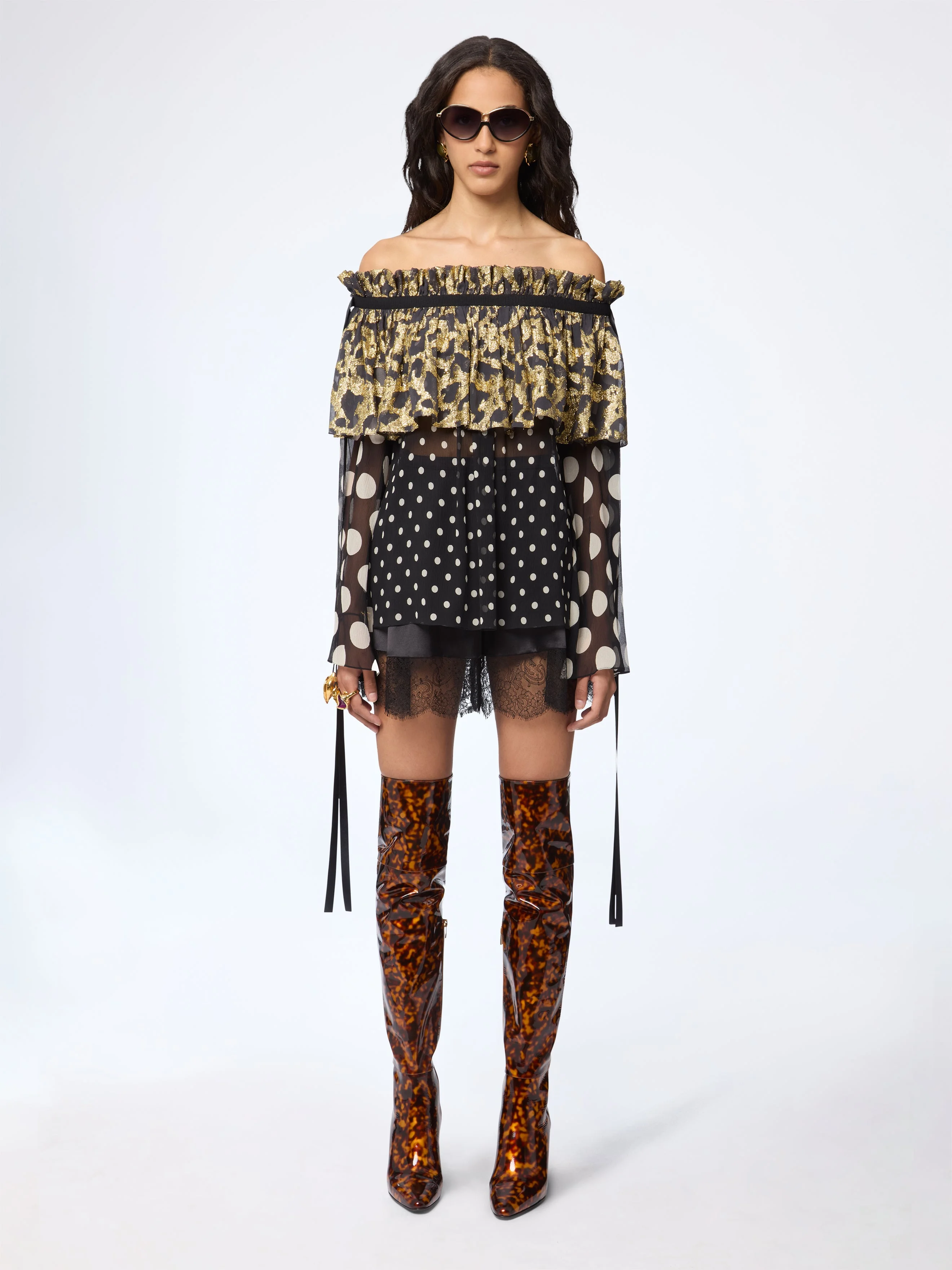 This off-the-shoulder satin top from the Spring-Summer 2026 collection fuses volume and transparency with striking visual rhythm. Combining oversized and micro polka dots with a ruffled floral print neckline, it reinterprets the house’s signature motifs through layered contrast. Long ribboned sleeves and lace trims complete this exuberant silhouette, where theatrical femininity meets sensual freedom. COMPOSITION & DETAILS - 100% silk. - Side bow details. - Model is 180 cm/ 5ft 11in and wears size 38 (FR). - Ref: 26PCTO023SE1409I9072