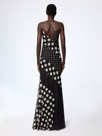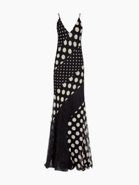 An emblematic silhouette of the Spring-Summer 2026 collection, this long silk dress plays with scale and rhythm through a patchwork of polka dots in varying sizes. Cut on the bias for graceful movement, it features a plunging neckline and diagonal lace inserts that contour the body with graphic elegance. COMPOSITION & DETAILS - 56% silk 44% polyester. - Lined with a dress. - Model is 180 cm/ 5ft 11in and wears size 36 (FR). - Ref: 26PCRO073SE1409I9072