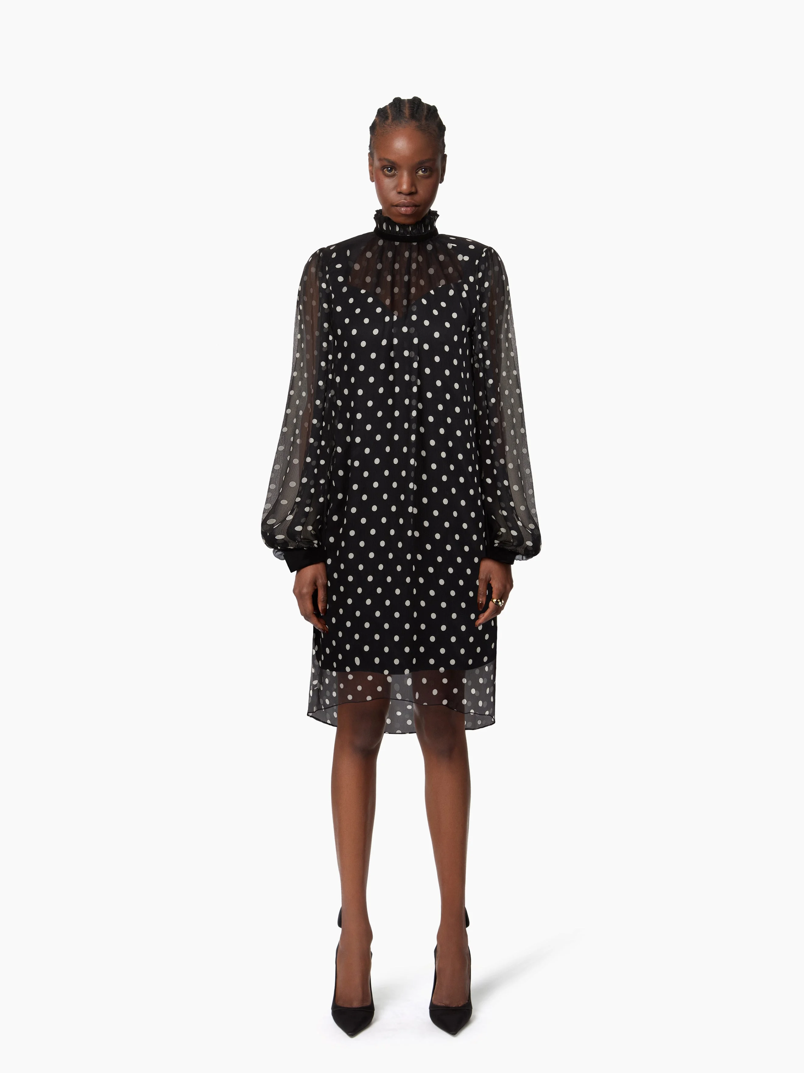 This long-sleeved black midi dress is crafted in cream polka-dot crinkled silk chiffon, a signature motif of Maison Nina Ricci. Its ruched high collar and sheer sleeves bring both elegance and lightness to the silhouette, channeling a romantic yet timeless spirit. COMPOSITION & DETAILS - 100% silk. - Straight cut. - Midi length. - High neckline. - Opaque slip lining. - Model is 180 cm/ 5ft 11in and wears a size 36 (FR). - Ref: 25ACRO056SE1409I9072
